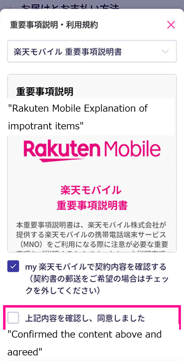 See if the information of your application is correct and tap "Apply with this content(「この内容で申し込む」)". Then, you check “I agree(「同意しました」)” for each terms of use (there should be a couple of terms).