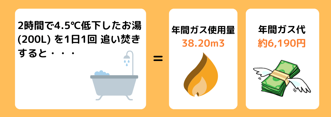 経済産業省・資源エネルギー庁によれば、1日1回の追い焚きをやめるだけで、年間約6,190円のガス代を節約できます。