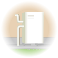 エコキュート(ヒートポンプ式給湯機):ヒートポンプ技術を利用し、空気の熱で湯を沸かすことができる電気給湯機。