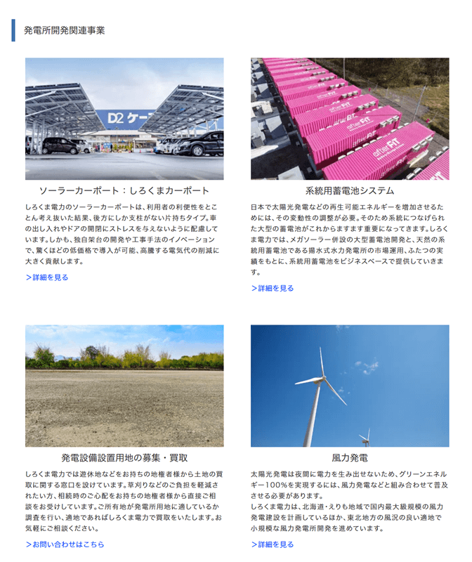 「しろくま電力株式会社」は再生可能エネルギ―に特化した事業を展開しており、電力小売り事業の他にソーラーカーポートや蓄電池の開発販売、風力発電事業も行っています。