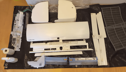 エアコンの分解作業では「そんなに分解しちゃって大丈夫?」と心配になるほど、エアコンのパーツを細かく分解。