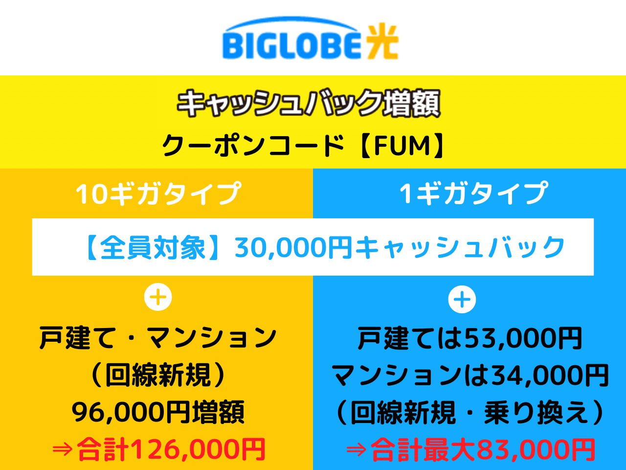 クーポンコード「FUM」でキャッシュバック増額中! ・1ギガ戸建て:53,000円増額 ・1ギガマンション:34,000円増額 ・10ギガ戸建て/マンション:96,000円増額 |