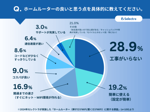 「ホームルーターの良いと思う点を具体的に教えてください」というアンケートに対し、「工事がいらない」と答えた人が28.9%、「簡単に使える」と答えた人が19.2%となり、実際に使ってみて手軽さに満足している人が多いことが読み取れます。