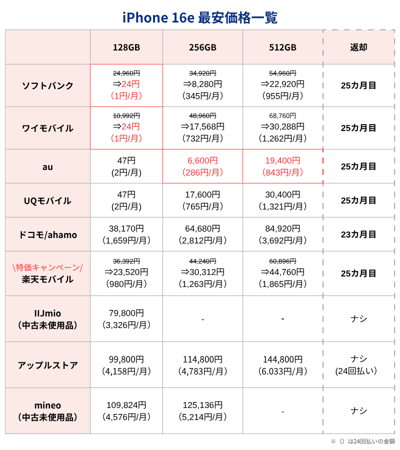 また、多くの携帯会社が、最新のiPhone 16eを実質1円スマホ(実質負担額24円)として販売しています。