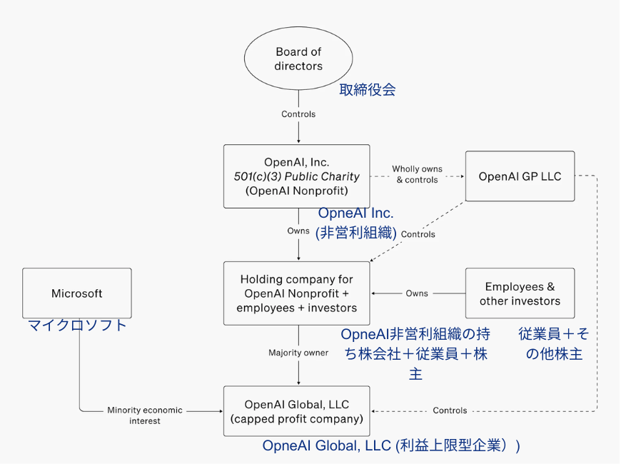 「すべての人類にAGI(汎用人工知能)が利益をもたらすこと」をミッションとして、2015年にOpenAIは非営利団体として設立されました。しかし、当初の予想をはるかに上回る莫大な開発費がかかることが分かると、2019年に営利子会社「OpenAI LP」を設立。「キャップトプロフィット型」(利益上限型)の特殊な組織構造を取ることにしました。